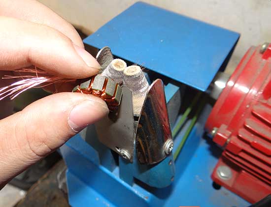 GD-4漆包线磨漆机新开发型经我们技术人员的刻苦攻关,对产品进行了彻底的关键性更新,采用更先进型的尖端技术及大量的进口配件,内含更高的技术含量,经多次实践证明,使用效果更出色、强劲、低噪音 。该产品使用效果大大优越于同类产品。可带有吸尘器配套 GD-4漆包线磨漆机适用线径:0.028—0.75mm 型号 GD-4 适用线径 0.028—0.75mm 机器尺寸 280*200*195mm 使用电压 220V/50HZ 电机功率 120W 电机转速 2800r/min和5333r/min(轮转速) 机器重量 6.5KG 选配轮子 锥型纤维轮和进口纤维轮(国际通用尺寸) 皮带尺寸 直径63*3.5mm 剥漆长度 2mm—无限长度 次实践证明,使用效果更出色、强劲、低噪音 。该产品使用效果大大优越于同类产品。 安装与使用 选择合适的我公司产品—“锥型”剥漆纤维轮或进口产品“锥型纤维轮”,安装在机器的两轴上。剥漆轮锥形部份向上,稍调间隙,启动电源,使机器正常运转一会儿。一切正常后关闭开关。将配置的网格砂皮放在两只锥面之间,调校两只剥漆轮之间的距离,以稍松为宜。重新启动设备,用手握住专业网格砂皮进行修磨两只轮子的接触面,以使两轮之间的接触面更贴切。准备就绪一切正常后,用同样的方法可以用线试剥了。试验剥漆效果,可通过调节装置来完成两只剥漆轮接触面的压力,最终达到理想的剥漆效果。 工作时只需将漆包线的处理端放入剥漆轮锥面间拉出,剥漆工作转眼间完成。通过锥形剥漆轮的高速运转,来完成将漆包线的绝缘层或氧化物磨掉的原理。剥漆后的漆包线,表面是光亮清洁。如单独使用一根漆包线去漆效果显著。(较细的规格可以多股进行。) 我公司生产的锥形剥漆轮,是可利用在轴上的轴环将轮子向上移动,进行合理的两轮移动,使之调至有利用价值的一面,重复上面的操作步骤,使之正常运转为止,直至损耗到整个轮子的底部。为方便操作,轮子和轴是通过静配合原理直接装插在轴上。因此,当重新更换新轮时,只需将旧轮直接拔出,插入新轮即可。重复上面的操作步骤,很快将会正常工作了。