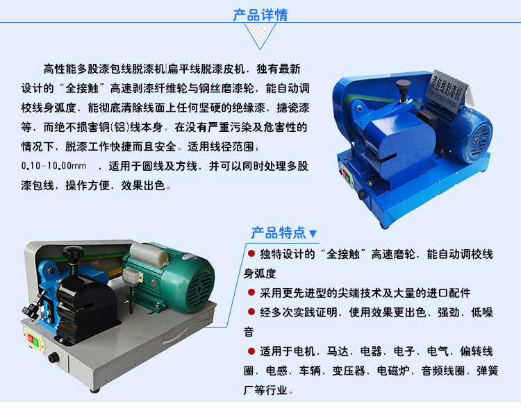 我们专门为您特别设计的各种不同功能和款式的漆包线脱漆机,有座台式的,有手提式的,有刮漆型的,也有磨漆型的,专业针对各种不同范围的线径来使用。能彻底去除线面上任何坚硬的绝缘漆,搪瓷漆,ML,lsonel等,而绝不损害铜线/铝线本身。漆包线磨漆机在没有严重污染及危害性的情况下,脱漆工作快捷而且安全。脱漆线径范围:0.028mm-6.8mm。漆包线剥漆机,漆包线去漆机,漆包线脱漆机,漆包线刮漆机,漆包线刮漆器,漆包线去漆器。
